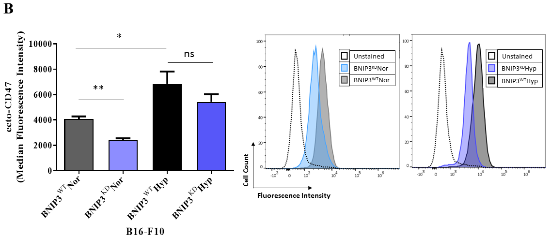 Figure 1: BNIP3 and hypoxia modulate the phagocytosis of B16-F10 melanoma cells by macrophages. (B) Flow Cytometry- based quantification (left panel) and representative histograms (right panel) of the level of surface CD47 (ecto-CD47) in B16-F10 cells (BNIP3WT and BNIP3KD) after 24 h of culture in normoxia (Nor) or hypoxia (Hyp). Data expressed as mean ± SEM and analysed with Mann-Whitney’s t-test (**p = 0.0043, *p = 0.0411, ns = not significant [p = 0.3052]) as indicated by the bar, n = 3 independent experiments).