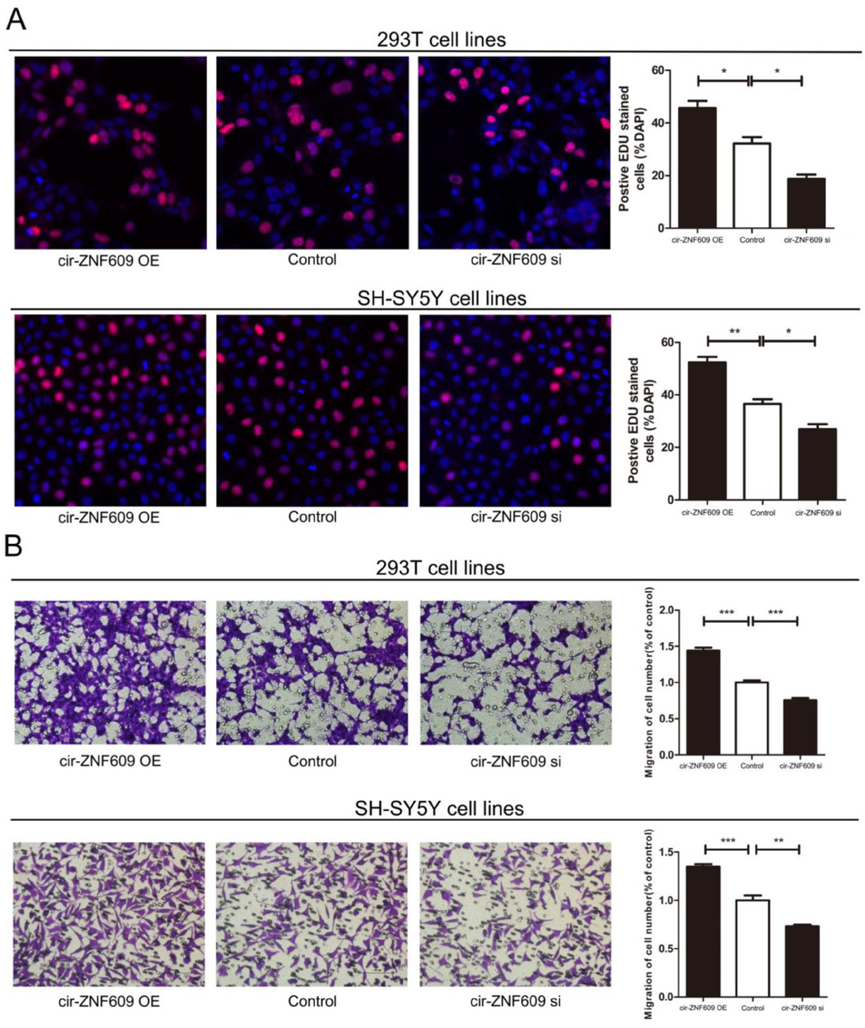 Figure 2: Cytobiology change after treating cells with cir-ZNF609 siRNA. (A) Human 293T and SH-SY5Y cell lines were transfected with cir-ZNF609 siRNA and over-expression plasmid to regulate its expression levels and cell proliferation was detected using the EDU assay. Knockdown of cir-ZNF609 suppressed cell proliferation and overexpression of cir-ZNF609 have the opposite effect. (B) Transwell assay was performed as described in method and indicated that down-regulation of cir-ZNF609 delayed cell migration. However, higher expression of cir-ZNF609 promoted the cell migration. Pictures were captured under a light microscope with the magnification, ×20.