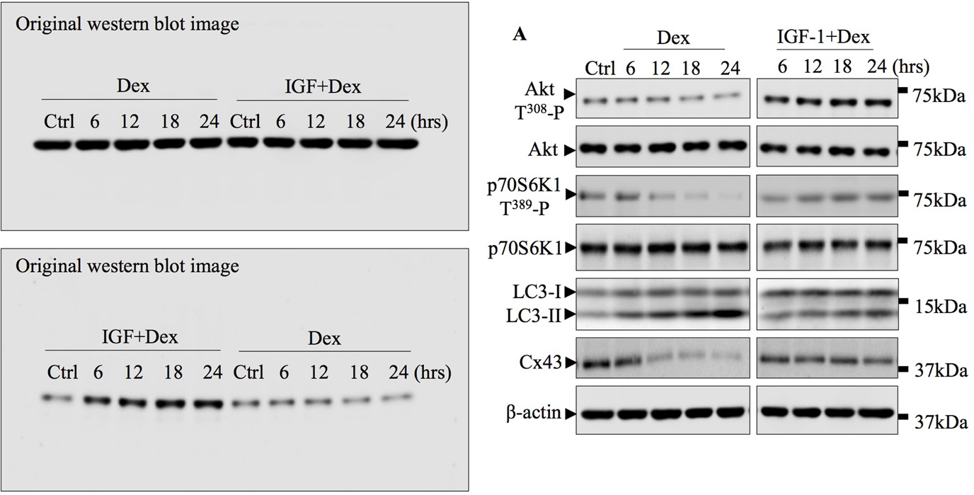 This article has been corrected: Due to a software malfunction while cropping the western blot image into the PDF, the previous image for β-action (in IGF-1+Dex group) and for Akt T308 -P (in Dex group) in Figure 6A is incorrect. The corrected Figure 6A is shown below. The original image for western blot is also attached. The authors declare that these corrections do not change the results or conclusions of this paper.