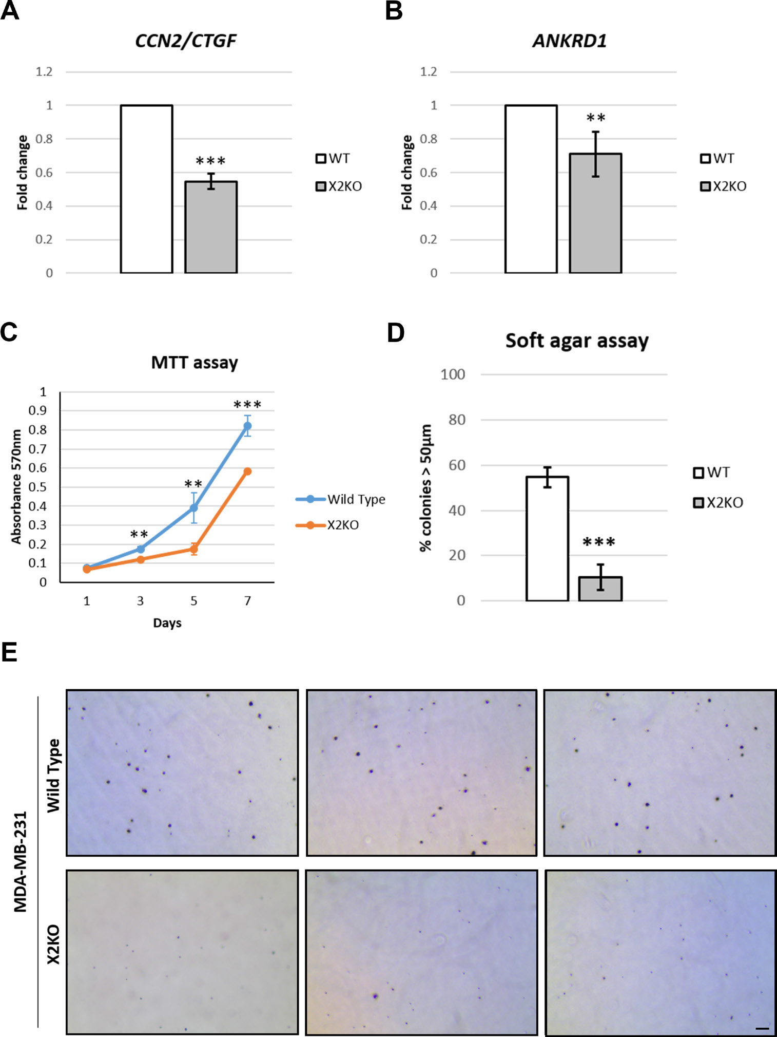 Figure 5: Loss of POPX2 reduces TAZ target gene expression and growth. MDA-MB-231 wild type and X2KO cells were grown to high cell density. Cells were harvested and the RNA collected were converted to cDNA and subjected to RT-PCR to quantify the amount of (A) CTGF and (B) ANKRD1 transcript levels. (C) Cell proliferation were quantified using MTT assays on Day 1, 3, 5 and 7. Three independent experiments were performed. Error bars represent standard deviation. Student t-test was performed to determine statistical significance. **p < 0.01, ***p < 0.001. (D) Cells were grown in 3D soft agar assay for up to 28 days. The numbers of total colonies and colonies with diameter more than 50 μm were counted. Three independent experiments were performed. Error bars represent standard deviation. Student t-test was performed to determine statistical significance. (E) Representative bright field images of crystal violet stained cell colonies in soft agar assay. Scale bar: 200 μm.
