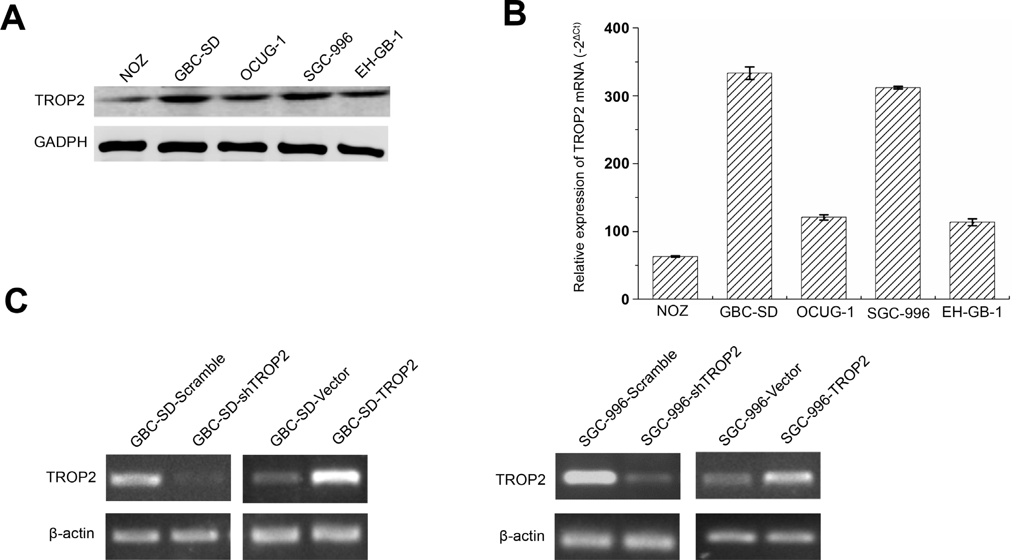 Figure 2: TROP2 expression in GBC cell lines. (A) The TROP2 protein expression of human GBC cell lines NOZ, GBC-SD, OCUG-1, SGC-996 and EH-GB-1B. (B) The TROP2 mRNA expression of human GBC cell lines NOZ, GBC-SD, OCUG-1, SGC-996 and EH-GB-1B. (C) TROP2 mRNA expressions of GBC-SD and SGC-996 cells after RNA interference and plasmid transfection. Cells were transfected with scramble sh-RNA and empty vector as negative controls. Each experiment was repeated three times.