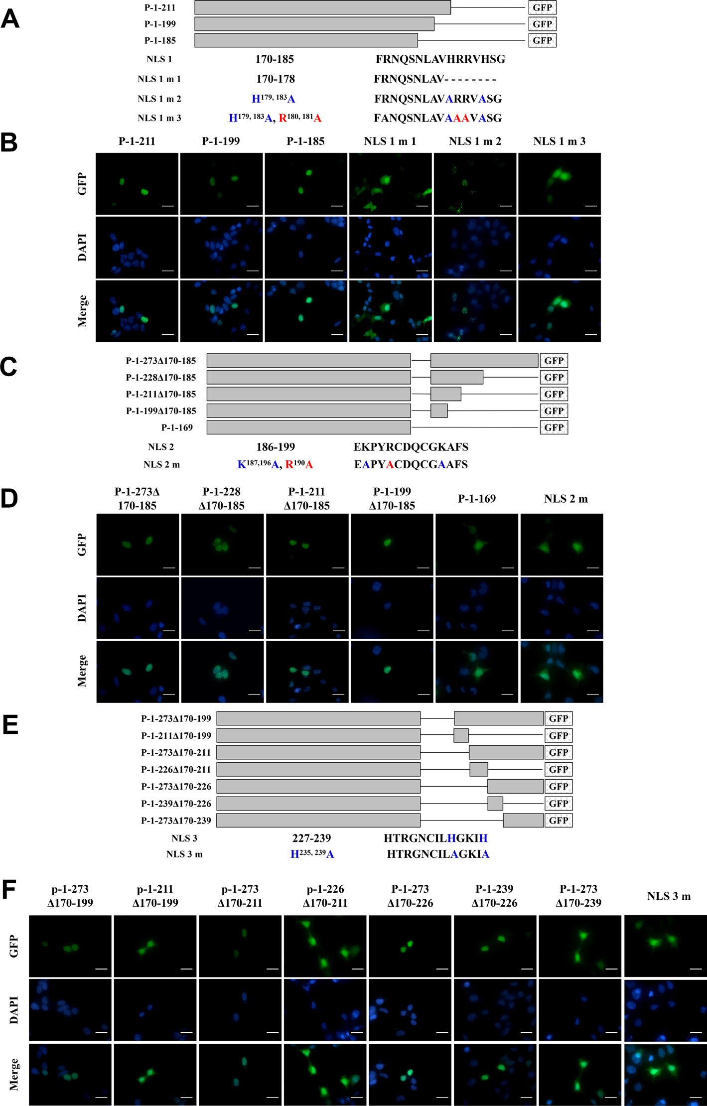 Figure 6: Identification of NLSs in ZNF32 and the localization of NLS mutants. (A, B) ZNF32 NLS 1 (Aa 170-185). (A) Schematic representation of recombinant, GFP-tagged ZNF32 mutant proteins. Lines represent the deleted sequences in the proteins. (B) The subcellular localization of ZNF32 and NLS 1 mutant proteins. Recombinant proteins are shown in green (GFP), and cell nuclei are shown in blue (DAPI). (C, D) ZNF32 NLS 2 (Aa 186-199). The basic amino acids Lys and Arg were replaced with Ala in NLS 2 mutant. (C) Schematic representation of the recombinant, GFP-tagged ZNF32 mutants. Lines represent the deleted sequences in the proteins. (D) The subcellular localization of ZNF32 and NLS 2 mutant. Recombinant proteins are shown in green (GFP), and cell nuclei are shown in blue (DAPI). (E, F) ZNF32 NLS 3 (Aa 227-239). (E) Schematic representation of the recombinant, GFP-tagged ZNF32 mutants. Lines represent the deleted sequences in the proteins. (F) The subcellular localization of ZNF32 and NLS 3 mutant. Recombinant proteins are shown in green (GFP), and cell nuclei are shown in blue (DAPI). Scale bar = 50 μm.