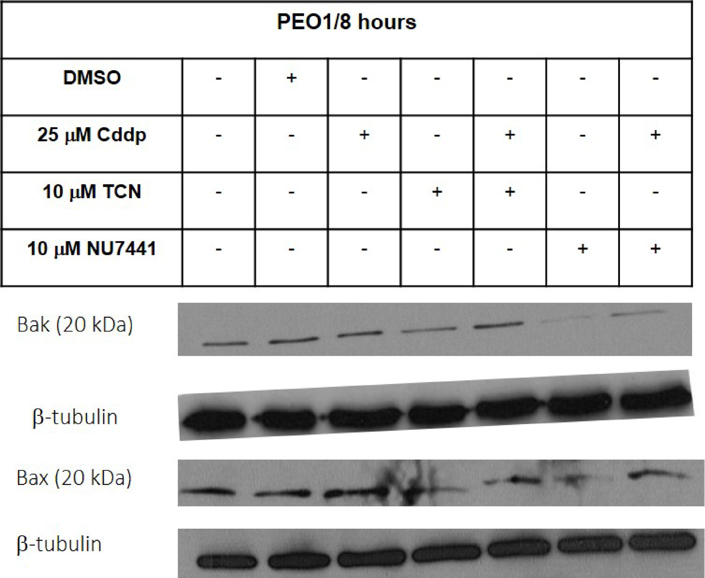 Figure 2: Expression of pro-apoptotic Bcl-2 family proteins in PEO1 and PEO4 cells in response to treatment with cisplatin, TCN and NU7441. Cisplatin-sensitive PEO1 and cisplatin—resistant PEO4 cells were treated as indicated. Cell lysates were prepared and were separated by 12% SDS-PAGE gel as described in Materials and Methods. Western Blotting was carried out to examine expression of (A) multi-domain pro-apoptotic Bax and Bak.
