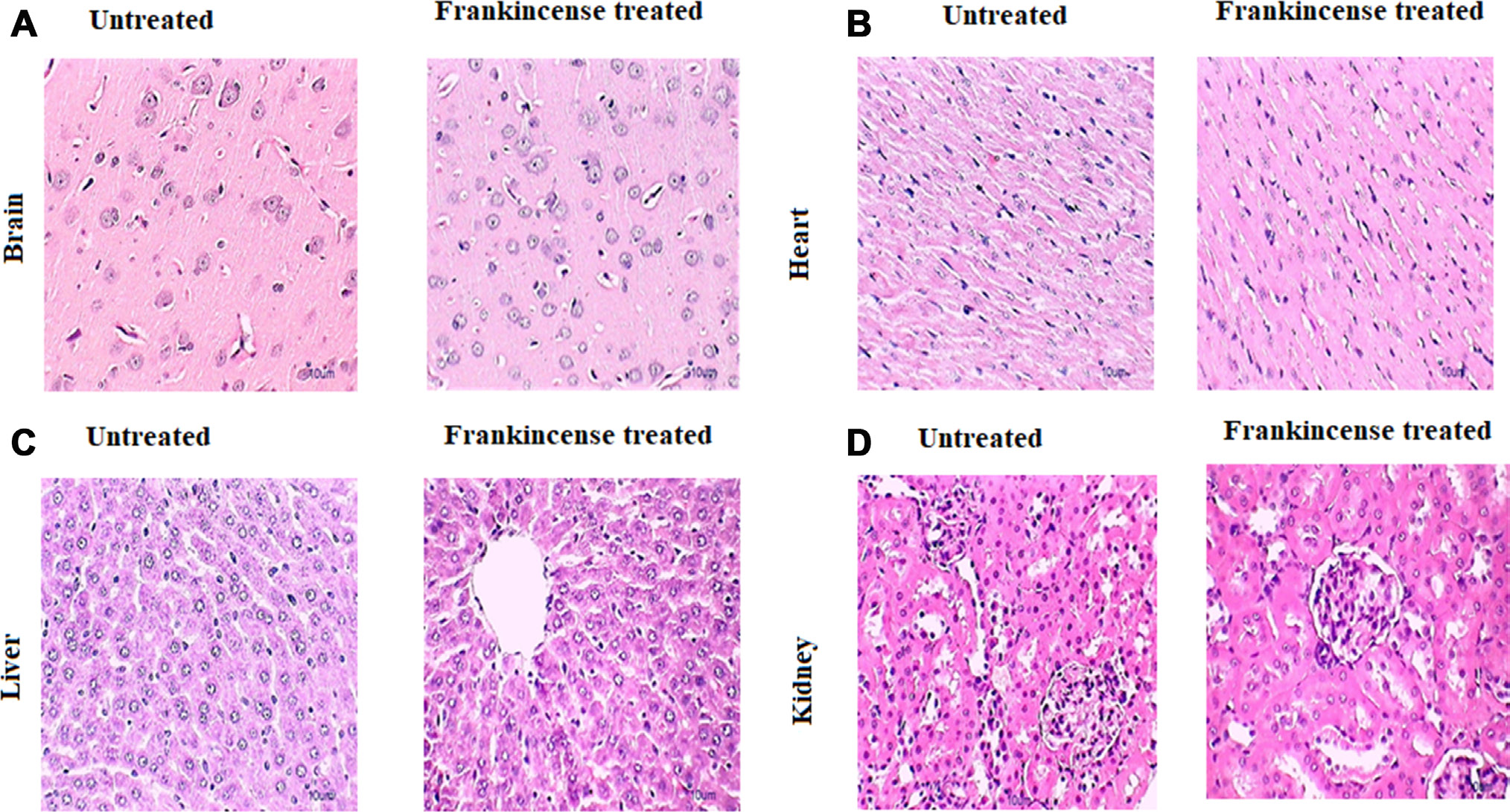 Figure 7: In vivo of toxicity of FEO on major organs: Mice were treated with FEO (1200 mg/kg body weight). At the end of experimental period major organs such as brain, heart, liver and kidney were excised and stained with hemotoxylin and eosin. Scale bar indicates 10 μm.