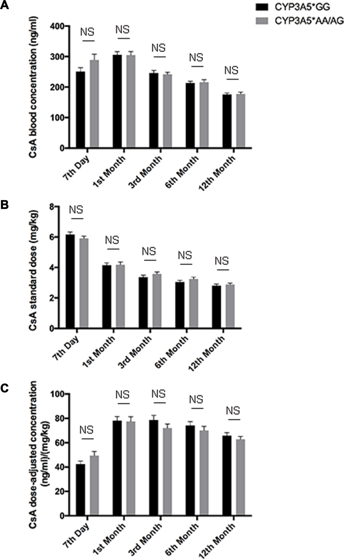 Figure 2: CsA dose adjusted concentration related to CYP3A5 genotype. CsA blood concentrations A., CsA standardized dose B. and dose normalized CsA concentration C. of CYP3A5* GG recipients and CYP3A5* AA/AG recipients at 7th day, 1st month, 3rd month, 6th month and 12th month after the kidney transplantation. NS: not significant. Error bars in graphs indicates SEM.