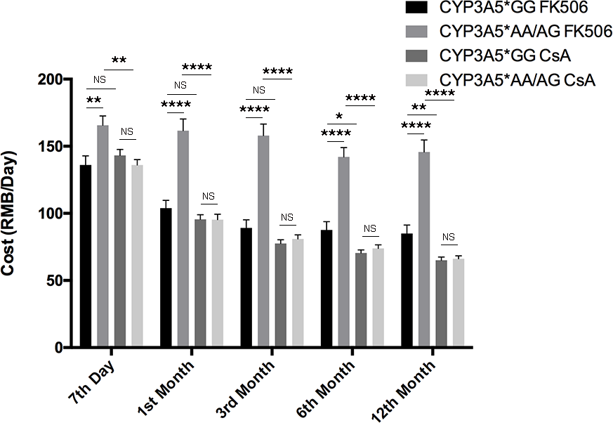 Figure 4: Costs of patients related to CYP3A5 genotype and different immunosuppressors. Participants’ cost of immunosuppressive agents of different CYP3A5 genotypes. NS: not significant, *: p < 0.05, **: p < 0.01, ****: p < 0.0001, Error bars in graphs indicates SEM.
