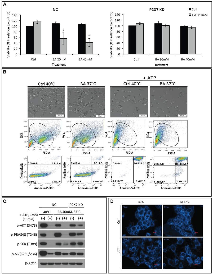 Figure 4: The membrane fluidizer benzyl alcohol (BA) acts similarly as hyperthermia leading to P2X7 hyperactivation at 37°C. NC (negative control) or P2X7 KD (P2X7-deficient) cells were exposed to BA alone or together with ATP for 15 min at 37°C (in order to mimic the heat effect per se) or 40°C. Cells treated with media served as control (Ctrl). (A) Cell viability and (B) images of live cells (upper panel) and FACS analyses of NC cells (middle and bottom panels) were determined. (C) Western blot analysis of AKT/PRAS40/mTOR pathway components was performed immediately after treatment. (D) Re-organization of cholesterol-rich microdomains in co-treated NC cells was visualized using filipin. *p < 0.05 when compared to control (two-way ANOVA, followed by Bonferroni pos-test, mean ± SD). Bars, 50 μM (B) and 20 μM (D).