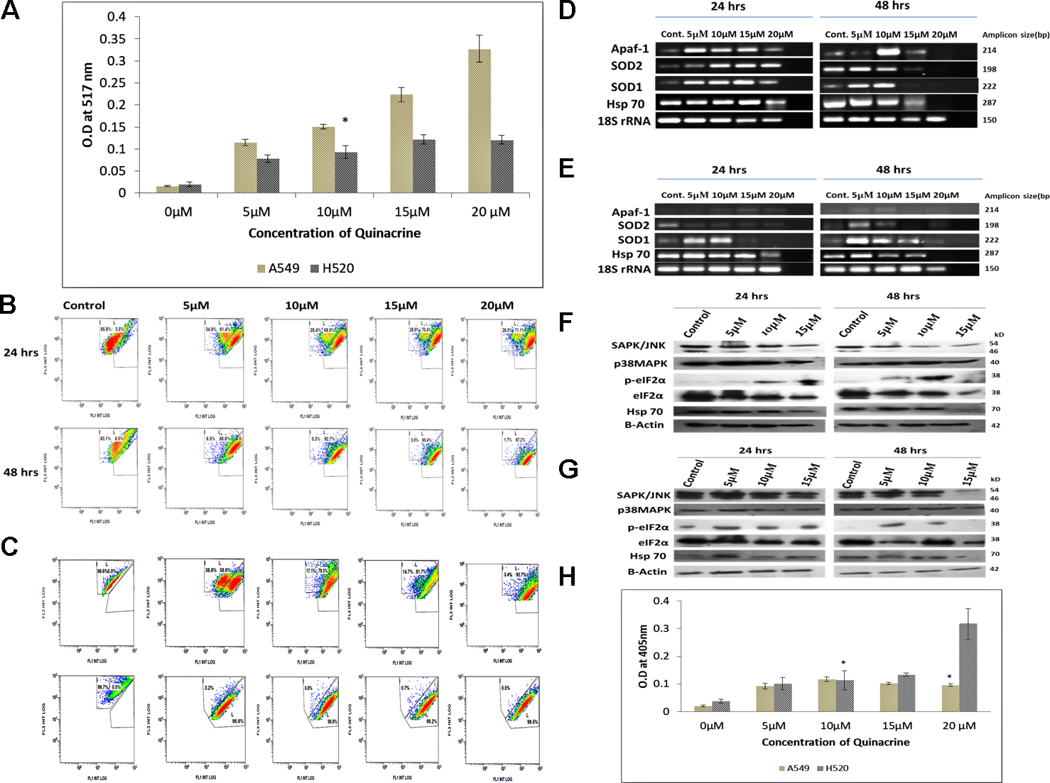 Figure 4: (A) Graphical representation of the estimation of reactive oxygen species (ROS) generated due to QC exposure. Data represented here is the mean (± SD) of three independent experiments (* = P values > 0.05). (B) and (C) Analysis of QC’s effect on mitochondrial membrane potential of A549 and NCI H520 cells respectively by JC-1 dye. Cells were grown on 6-well plates and exposed to QC. Post exposure the cells were stained with JC-1 dye and analyzed by flow cytometry. (D) Analysis of QC’s effect on mRNA level expression of oxidative stress responsive genes for 24 and 48 hrs time points by RT-PCR in A549 cells. (E) Analysis of QC’s effect on mRNA level expression of oxidative stress responsive genes for 24 and 48 hrs time points by RT-PCR in NCI H520 cells. (F) Protein level expression analysis of stress kinases and chaperones after QC exposure for 24 and 48 hrs by western blot in A549 cells. (G) Protein level expression analysis of stress kinases and chaperones after QC exposure for 24 and 48 hrs by western blot in NCI H520 cells. (H) Graphical representation of the concentration of activated caspase-3 protein in A549 and NCI H520 cell lines after QC exposure for 24 hrs time period. Data represented here is the mean (± SD) of three independent experiments (* = P values > 0.05).