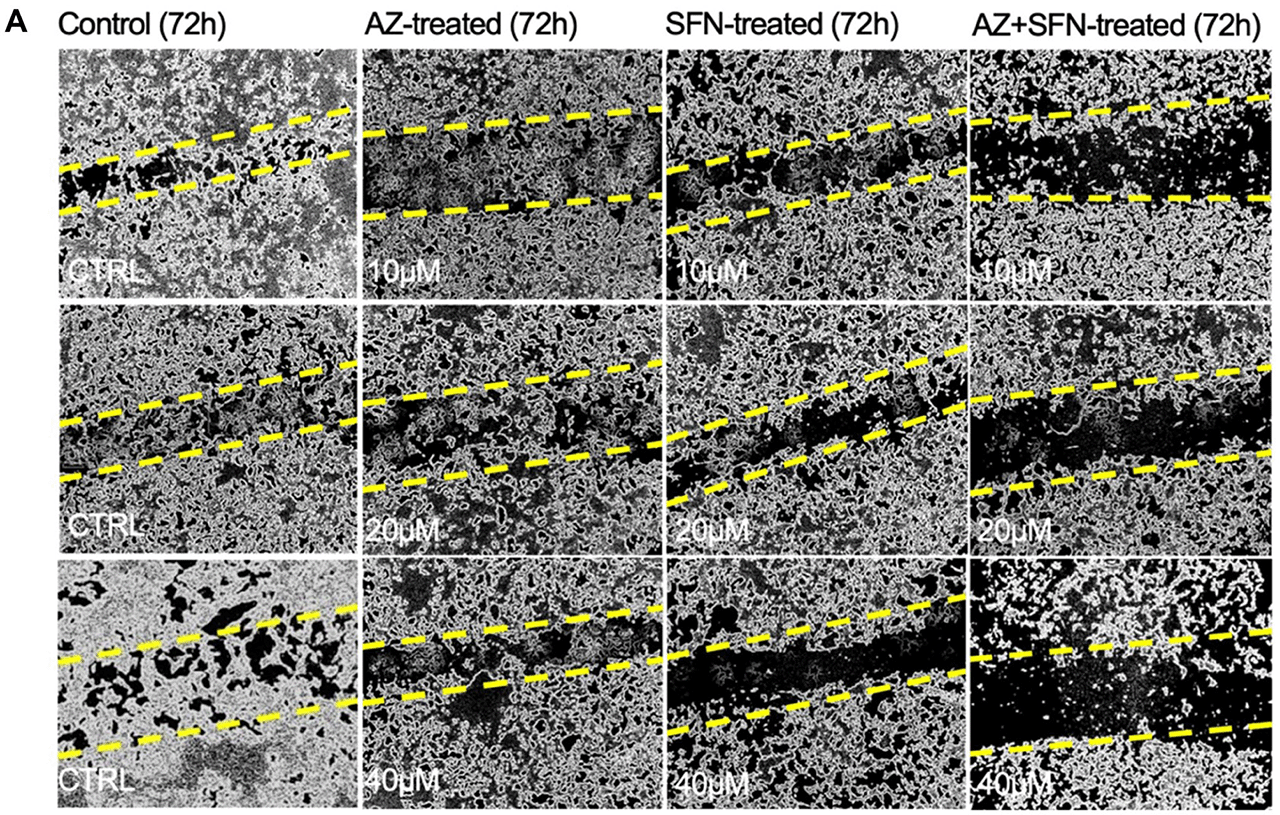 Figure 1: (A) AZ, SFN, and the combination of AZ+SFN dose-dependently affect the ability for wound closure of typical H727 BC cells measured over 72 hours compared to untreated control cells using a scratch wound assay. (A) Pictures representative of two separate experiments (n = 2) performed in triplicates showing similar results.