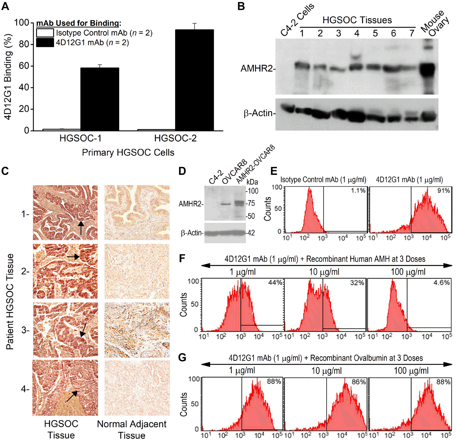 Figure 2: The 4D12G1 mAb recognizes AMHR2-ED in human EOC and competes with AMH for b inding to AMHR2-ED. (A) Flow cytometry analysis showing that the 4D12G1 mAb binds to the majority of cells generated from two primary HGSOC tissues examined. Error bars indicate ± SD. (B) The 4D12G1 mAb was used in Western blots of seven different HGSOC tissue lysates (25 μg protein/lane) with a positive control lysate generated from a young C57BL/6 ovary and a negative control lysate generated from C4-2 human prostate cancer cells. Immunostaining with a β-actin antibody was used to confirm normalized lysate loading. The Western blots shown are representative of three experiments that provided similar results. (C) The 4D12G1 mAb was used in immunohistochemical staining (20×) of tissue sections from four HGSOC patients (left column) and their normal adjacent fallopian tube tissues (right column). Arrows indicate staining of the tumor parenchyma. The stromal areas of the EOC tumors were not immunostained nor were all areas of the normal adjacent fallopian tube tissues. All experiments were performed three times yielding similar results. (D) Western blot analysis of lysates from OVCAR8 cells and AMHR2-OVCAR8 cells with lysates from C4-2 prostate cancer cells used as controls and immunostaining with a β-actin antibody was used to confirm normalized lysate loading. Flow cytometry analysis showed that: (E) the 4D12G1 mAb binds to 91% of AMHR2-OVCAR8 cells; (F) the AMH cognate ligand for AMHR2-ED effectively competes in a dose-dependent manner with the 4D12G1 mAb for binding to AMHR2-OVCAR8 cells; and (G) recombinant ovalbumin failed to compete with the 4D12G1 mAb for binding to AMHR2-OVCAR8 cells. Data are representative of three independent experiments yielding similar results.