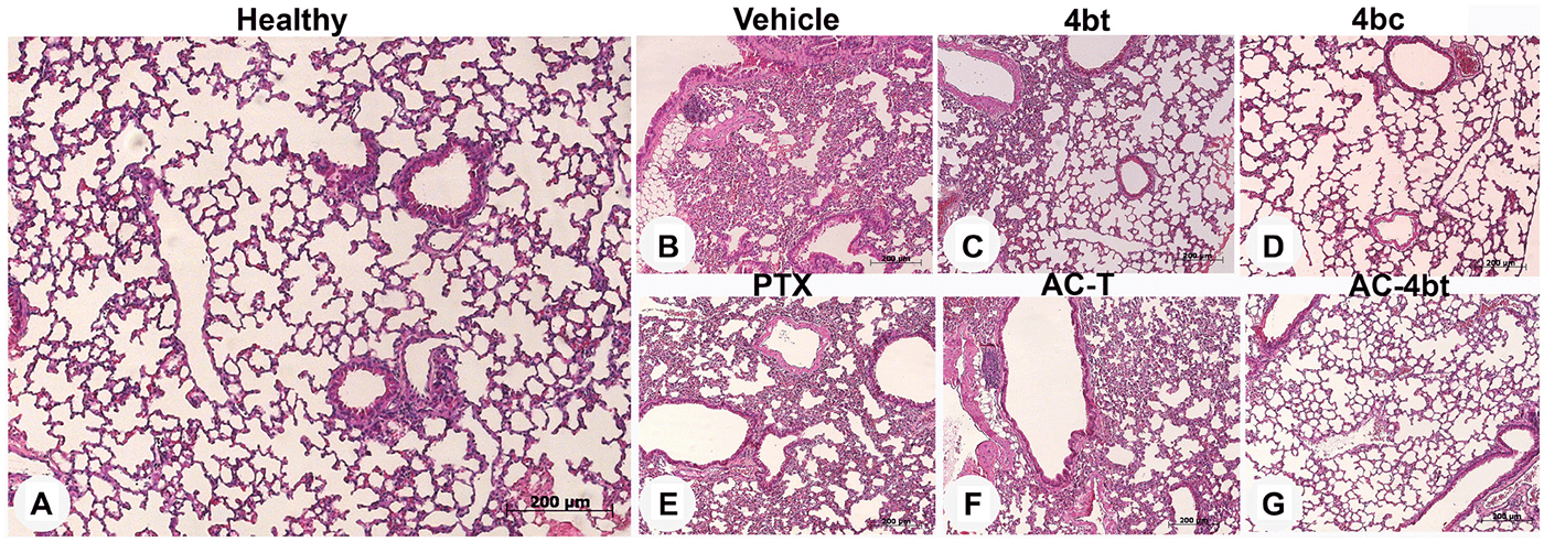 Supplementary Figure 1: Histopathological analysis of lung sections in control animal and upon monotherapy or drug combination treatments. Representative images of paraffin-embedded sections of lungs stained with H&E from the different experimental groups: (A) Healthy control, or administered intraperitoneally (i.p.) with: (B) vehicle, (C) 4bt (80 mg/Kg), (D) 4bc (80 mg/ Kg), (E) paclitaxel (20 mg/Kg), (F) Doxorubicin (10 mg/Kg) + Cyclophosphamide (100 mg/Kg) followed by paclitaxel (10 mg/Kg) (ACT) and (G) Doxorubicin (10 mg/Kg) + Cyclophosphamide (100 mg/Kg) followed by KIF11 inhibitor 4bt (AC-4bt). Metastatic foci or morphological alterations were not observed in any experimental group compared to control of healthy animals. Bars: 200 μm.