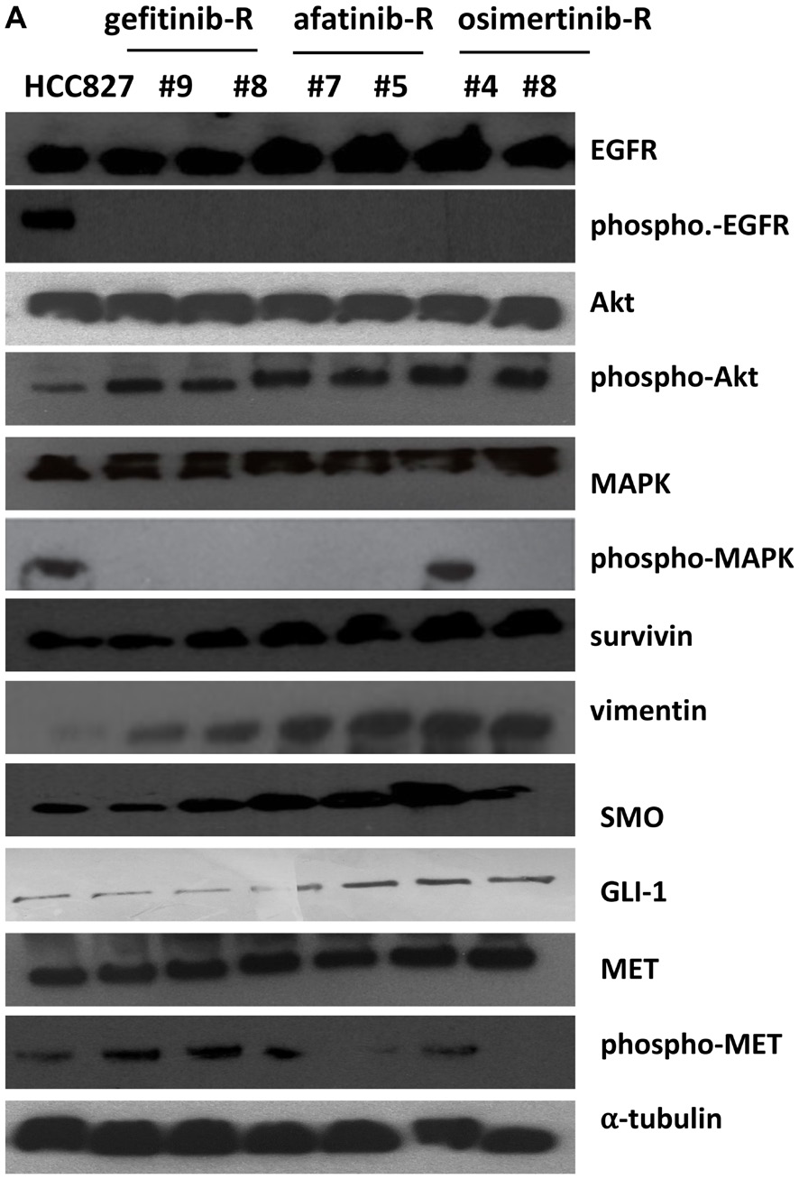 Figure 5: Western blot analysis on protein lysates and experiments on cell lines established in vitro from EGFR inhibitors-resistant HCC827 human tumor xenografts. (A) Western blot analysis on protein lysates from representative tumors of each line of treatment of EGFR-TKIs: gefitinib, afatinib, osimertinib.