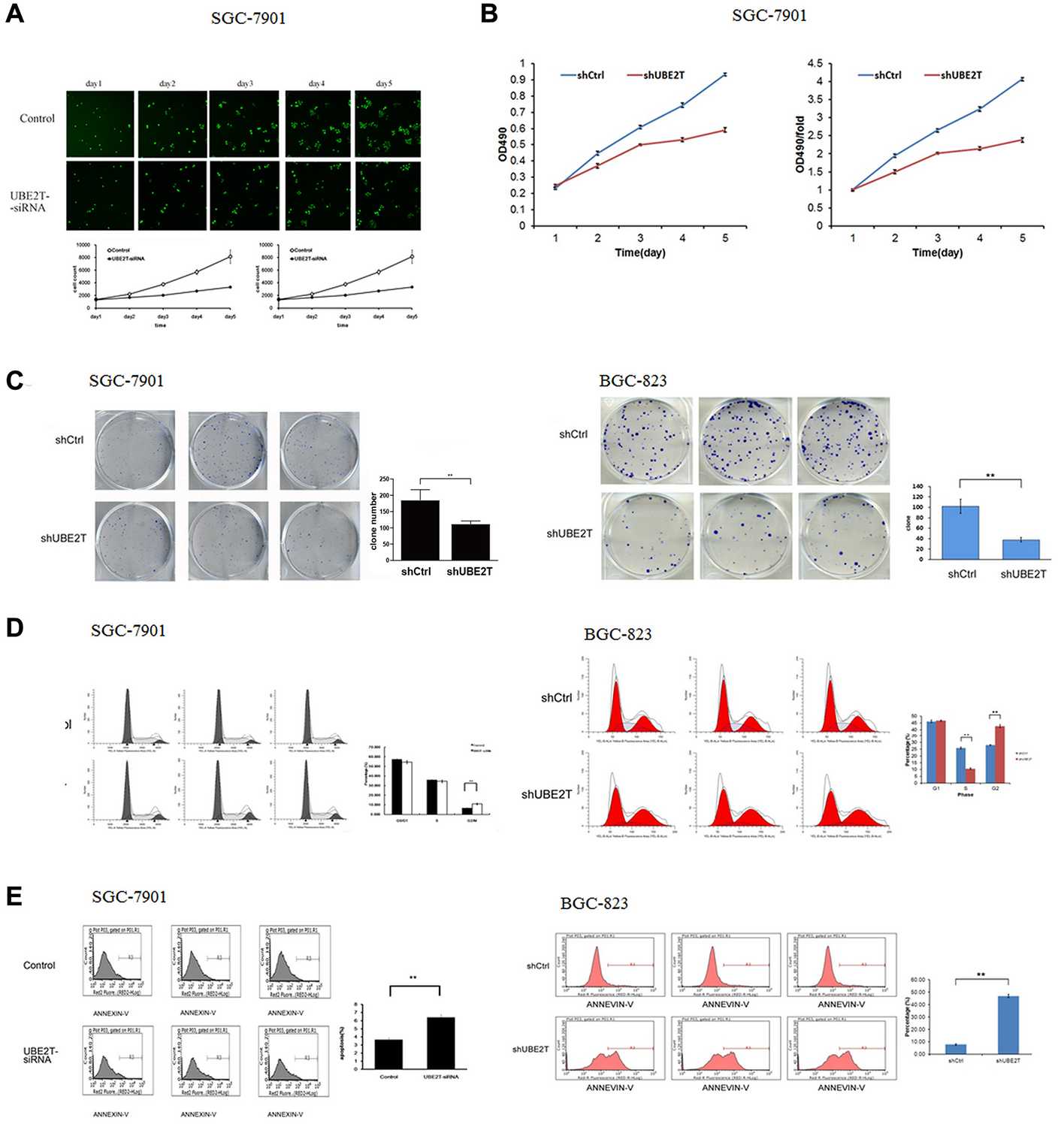 Figure 4: Suppression of UBE2T inhibits growth and colony formation in gastric cancer cells. (A) Cellomics detection indicated that SGC-7901 cell proliferation decreased after suppression of UBE2T. Data are presented as means ± SD. (B) MTT assays in SGC-7901 cells indicated that suppression of UBE2T inhibited SGC-7901 cell proliferation. Data are presented as means ± SD. (C) The tumor colony formation assay indicated that suppression of UBE2T inhibited tumor colony formation in SGC-7901 and BGC-823 cells. Data are presented as the means ± SD. **P < 0.01 versus the control group. (D) The percentages of cells in the G1, S, and G2/M phases were determined using FCM. G1 and S phase populations decreased while the G2/M phase population increased in SGC-7901 and BGC-823 cells. Data are presented as means ± SD. **P < 0.01 versus the control group. (E) Annexin V staining was measured using FCM to evaluate apoptosis. The percentage of apoptotic SGC-7901 and BGC-823 cells increased dramatically after siRNA lentivirus infection. Data are presented as means ± SD. **P < 0.01 versus the control group.