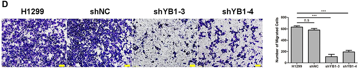 Figure 2: Inhibition of YB-1suppresses migration of lung adenocarcinoma cells. (A, B) Wound healing assay of lung adenocarcinoma cells in the YB-1-silenced cells (shYB1-1 and shYB1-2: YB-1-silenced A549 cells; shYB1-3 and shYB1-4: YB-1-silenced H1299 cells) and their corresponding control cells. The distance from the wound edge was calculated with corresponding summary (right panel). (C, D) Transwell assay in lung adenocarcinoma cells in the YB-1-silenced cells and their corresponding control cells. Columns were averaged from three independent experiments. *P < 0.05, ***P < 0.01, ***P < 0.005, two-tailed Student’s T-tests. Error bars represent mean ± s.d. Scale bars, 100 μm (A, B), 50 μm (C, D).
