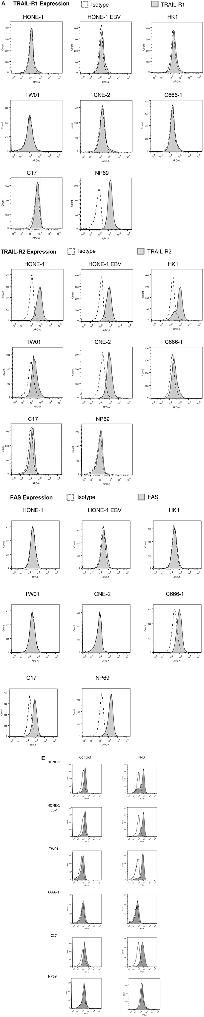 Figure 4: TRAIL induces apoptosis in NPC cells. (A) Surface expression of TRAIL-R1, TRAIL-R2 and FAS in NPC cells. TRAIL-R2 is expressed in all NPC cell lines but not nasoepithelial cells; low expression in cell line C-666-1 and C17-PDX cells; no expression of TRAIL-R1 in NPC cell lines but nasoepithelial cells. No expression of FAS except in nasopepithelial cells and low in NPC cell line C666-1 and C17-PDX cells. Data were acquired by flow cytometry and were compared to specific isotype controls. (E) Surface expression of TRAIL-R2 after incubation of cells with IFNβ. Cells were incubated for 72 h with (gray area) or without (white area) 1,000 U/ml IFNβ and then stained and analyzed as in (A). IFNβ upregulated TRAIL-R2 expression in NPC cell lines HONE, HONE-EBV, TW01 as well as C17-PDX cells but not in C666-1 cells and nasoepithelial cells.