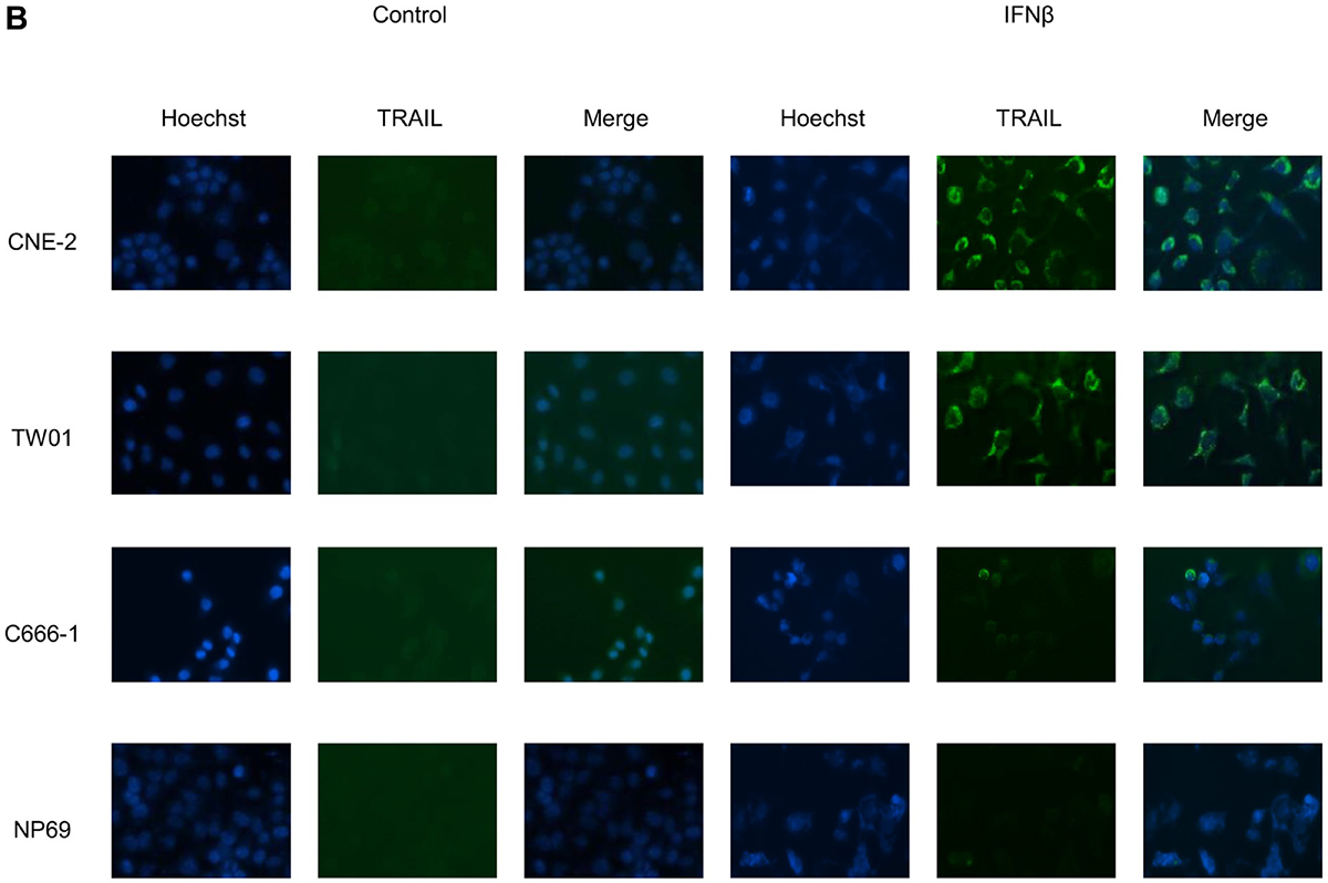 Figure 5: IFNβ induces surface expression of TRAIL in NPC cells. (B) Immunolocalization of TRAIL in NPC cells. Cells were treated for 72 h with IFNβ and stained for TRAIL as described in “Materials and Methods”. Nuclei were counterstained with Hoechst 33258. Immunofluorescence microscopy at 400× magnification demonstrates predominant localization of TRAIL on the cell surface.