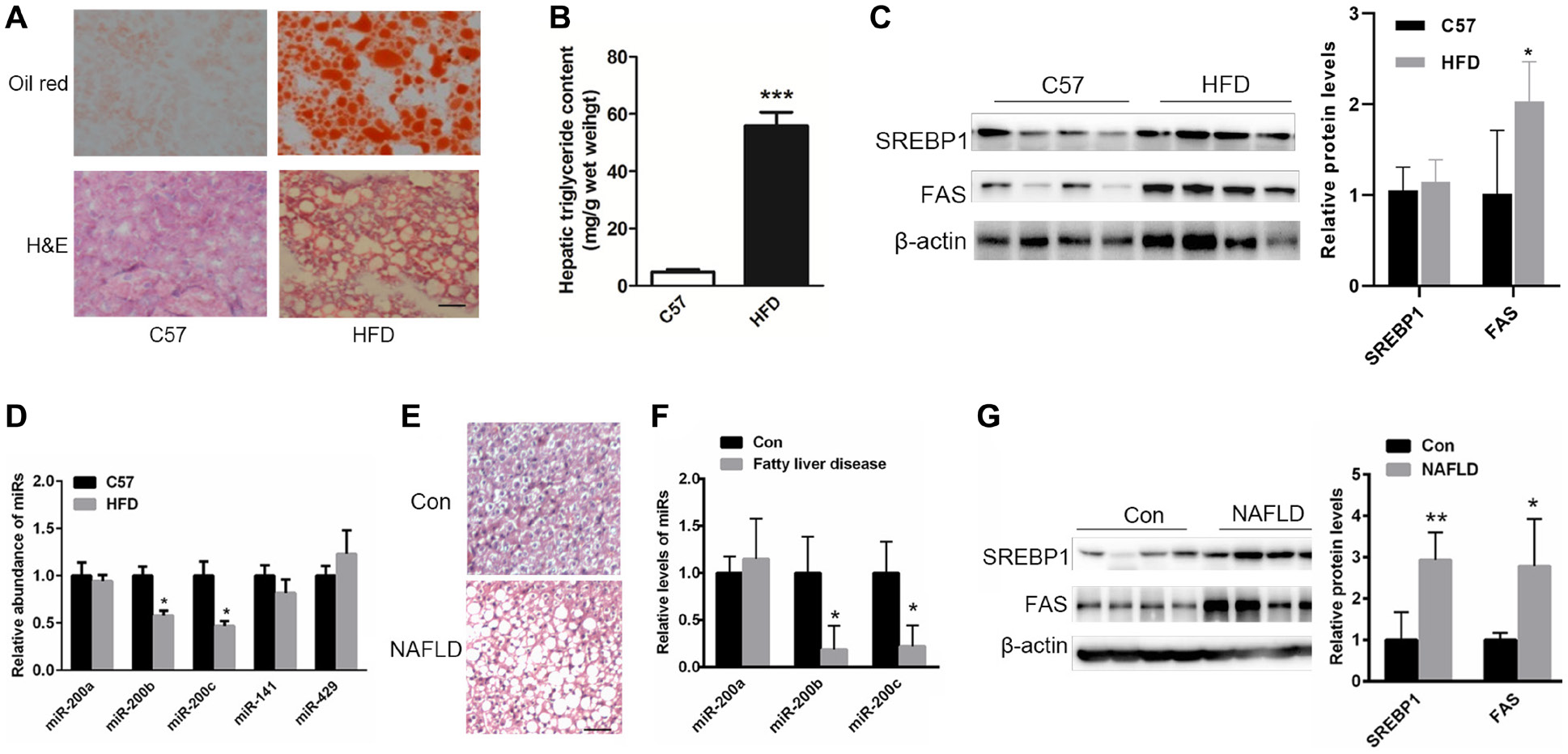 Figure 1: The levels of miR-200b and miR-200c are reduced in the steatotic livers of NAFLD patients and mice fed a HFD. (A) Oil red O and H&E staining of the livers of HFD-fed mice. (B) The measurement of triglyceride levels in the livers of HFD-fed mice. (C) Western blots showing the expression of the lipogenic proteins SREBP1 and FAS. (D, F) Real-time reverse-transcription PCR showing the relative expression patterns of miR-200 family members including miR-200b, miR-200c, miR-200a, miR-141 and miR-429 in the steatotic livers of HFD-fed mice (n = 5) or in the livers of NAFLD patients and healthy subjects (n = 11). (E) H&E staining of the livers of NAFLD patients. (G) Western blots showing the expression of SREBP1 and FAS in the livers of NAFLD patients. The data represent the mean ± SEM. *P < 0.05 and **P < 0.01 versus the control. The bar represents 25 μm.