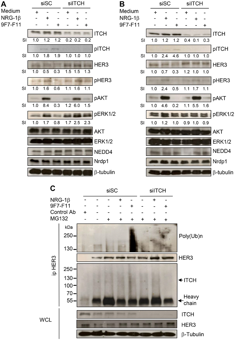 Figure 6: ITCH silencing inhibits 9F7-F11-mediated HER3 degradation and ubiquitination in cancer cells. Pancreatic BxPC3 (A) and prostatic DU145 (B) cancer cells were transfected with 10 nM Scramble Control siRNA (siSC) or the anti-ITCH/AIP4 siRNA (siITCH) for 72 hr, serum-starved and then incubated with 50 μg/mL 9F7-F11 or with 100 ng/mL NRG-1β for 4 hr. ITCH, HER3, AKT, ERK1/2, NEDD4 and Nrdp1 protein expression and ITCH, HER3, AKT and ERK1/2 phosphorylation were assessed in whole cell lysates (WCL) by western blotting. Band signal intensity (SI) was quantified with ImageJ, and β-tubulin was used as loading control. (C) BxPC3 cells were transfected with 10 nM siSC or siITCH for 72 hr, and then pre-incubated with 10 μM MG132 for 4 hr before addition of 9F7-F11 or NRG1-β for 4 hr. After immunoprecipitation with HER Ab, the HER3 ubiquitination status was analyzed by western blotting with a specific poly-ubiquitin chain antibody. HER3 and ITCH proteins were also detected by using specific antibodies.
