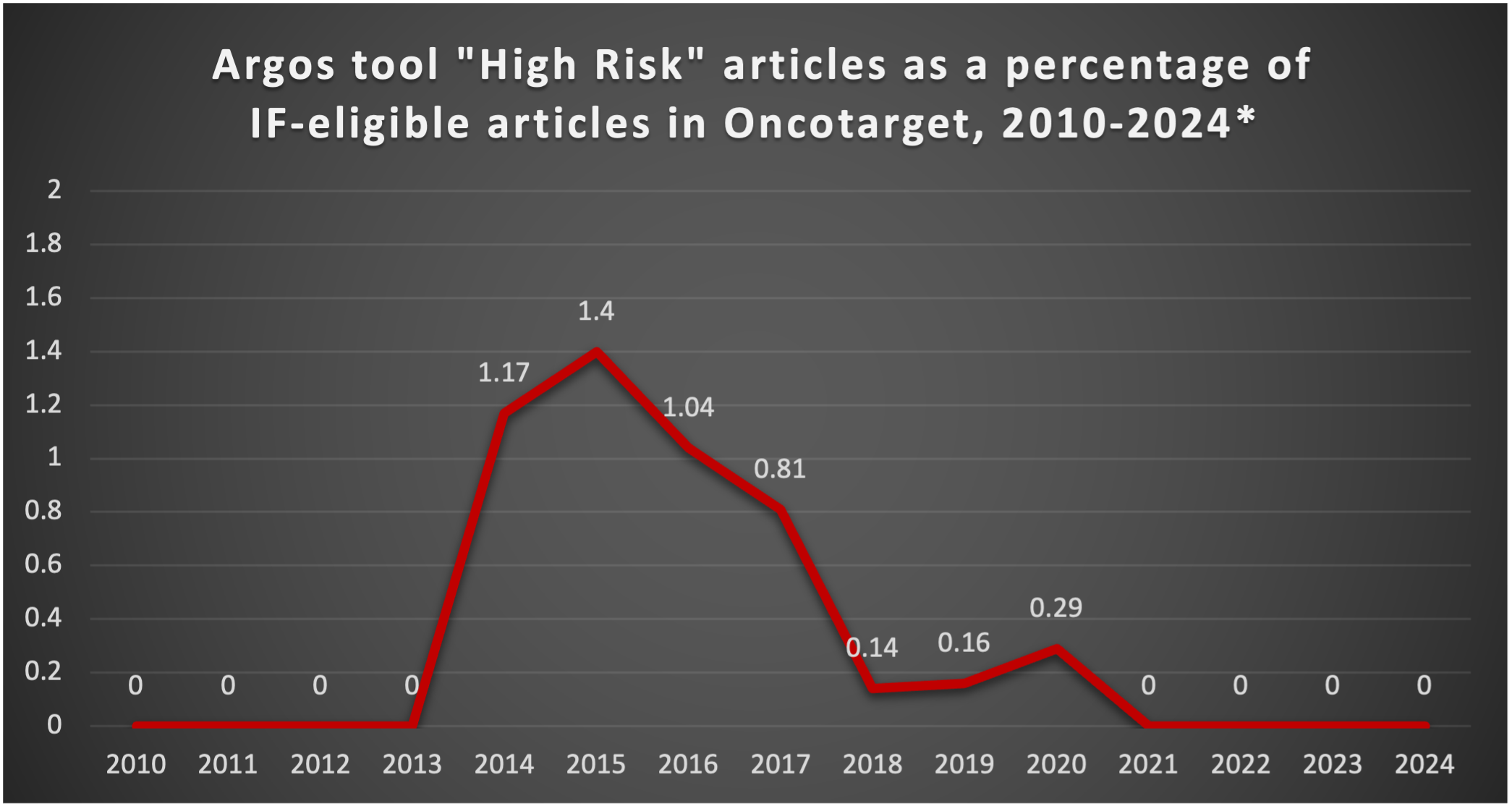 We utilized the tool to assess the number of high-risk articles within our journal, Oncotarget. Subsequently, we calculated the percentage of these high-risk papers relative to the total number of published articles and relative to the IF-eligible number of published articles for each specific year.